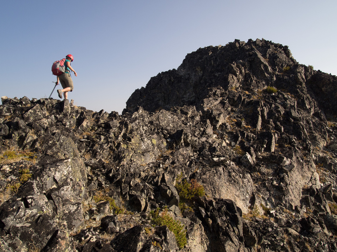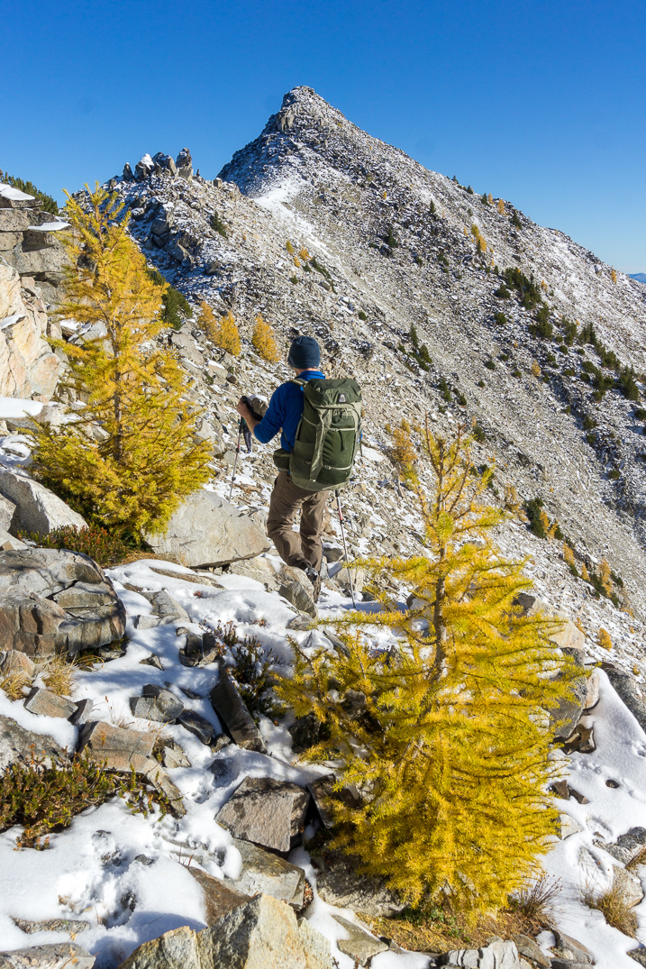 Lindsay on the traverse back to the 7,400' notch. The summit of Azurite Peak is in the background.