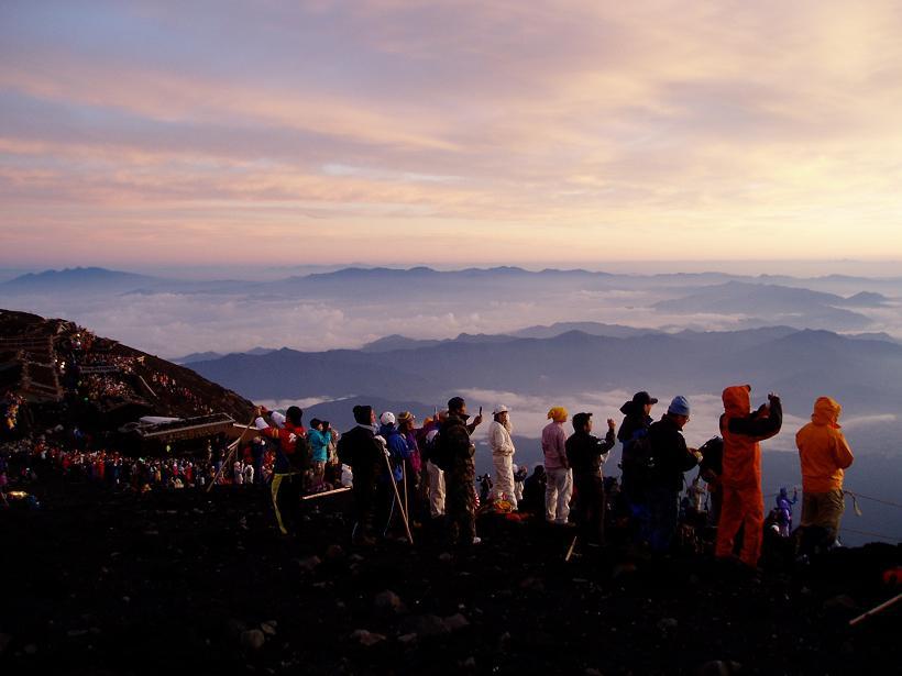 Hundreds of people on the summit of Mount Fuji. Note how some people are taking pictures of the sunrise with their cell phones.