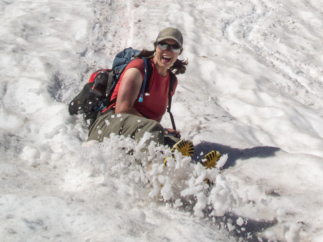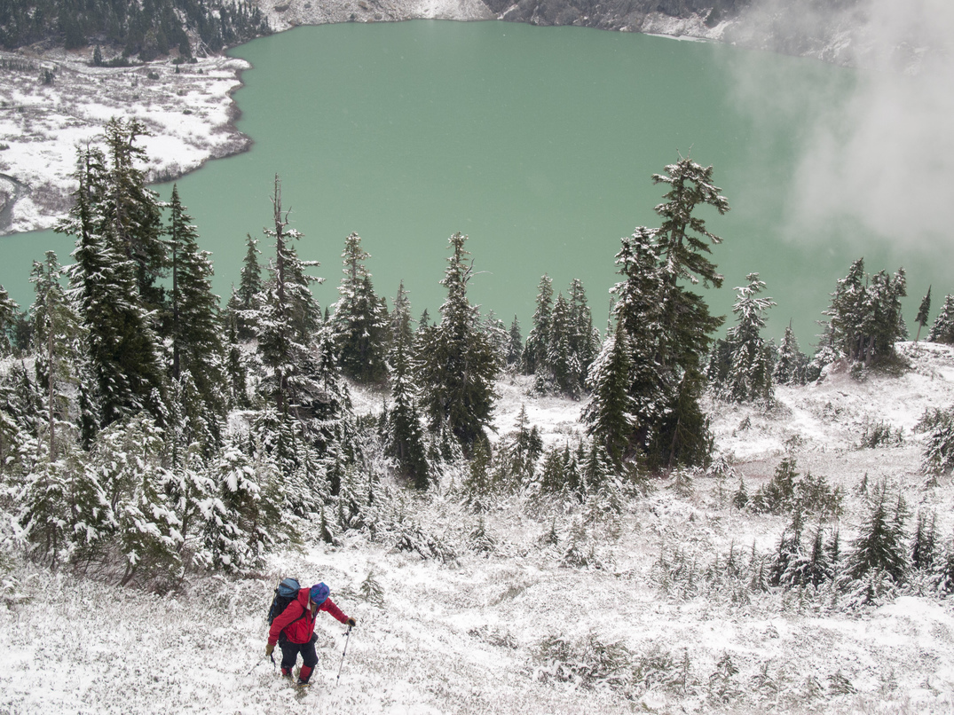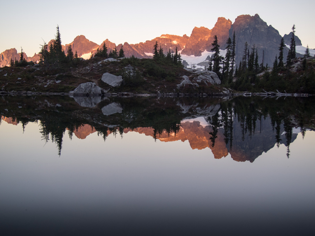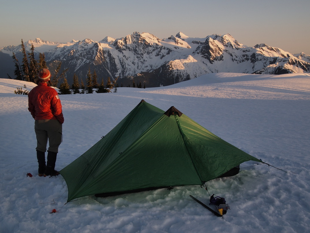 Early morning yoga below Chikamin Lake. The SE towers of Lemah are in the background.