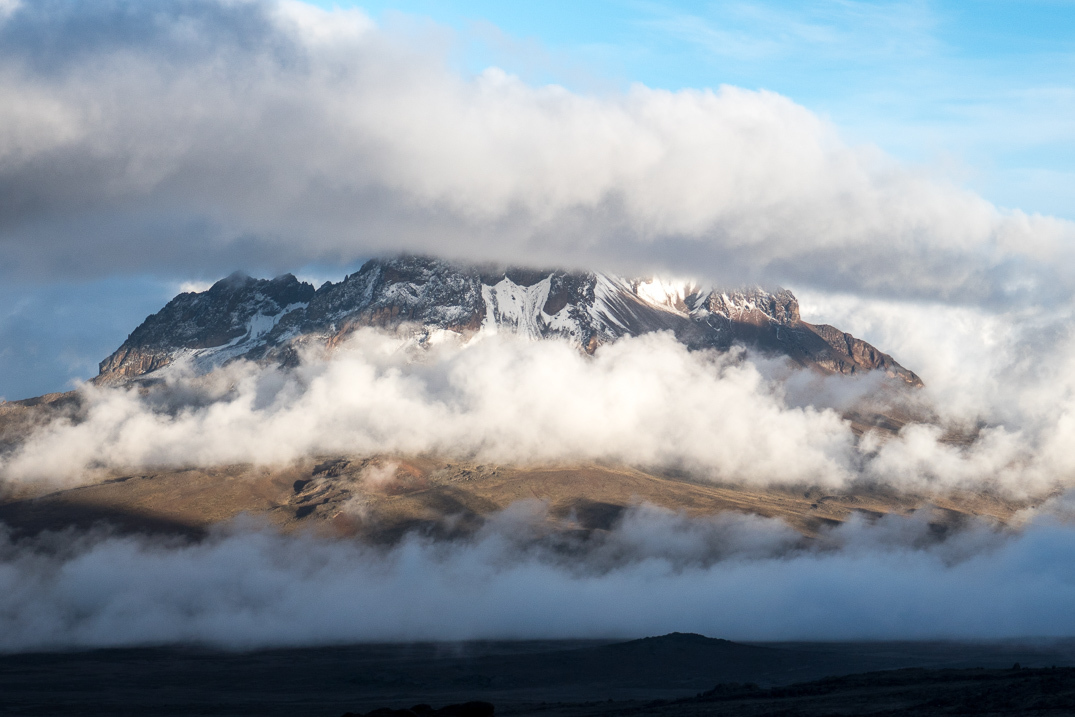 Mount Meru over the Southern Icefield and the shadow of Mount Kilimanjaro