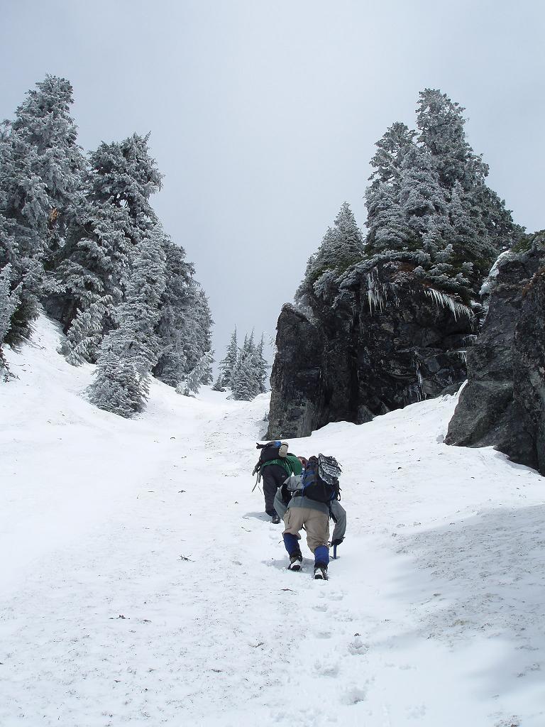 headed north up a steep gully then through open slopes and into the