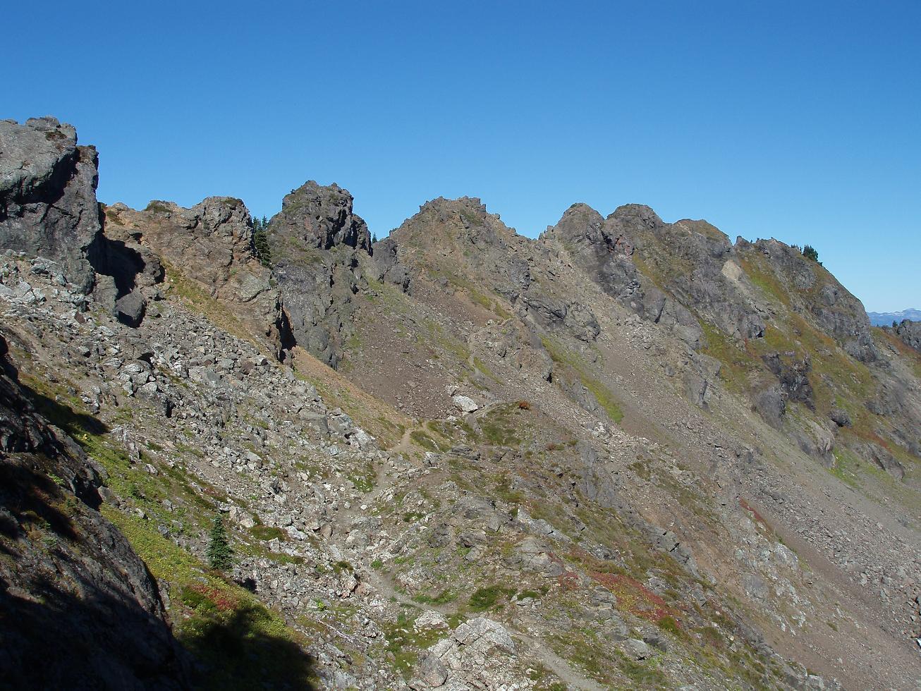 The summit of Sauk Mountain is about 8 rocky crags, the trail leads to