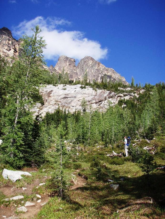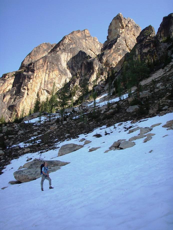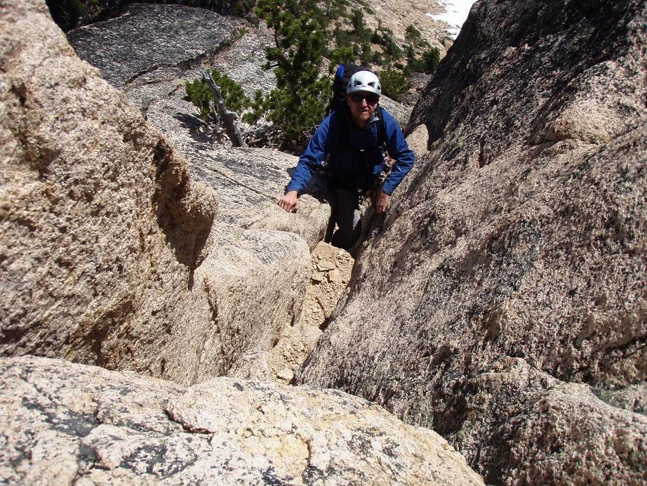 Ian studying the SW buttress route (Liberty Bell in the background)