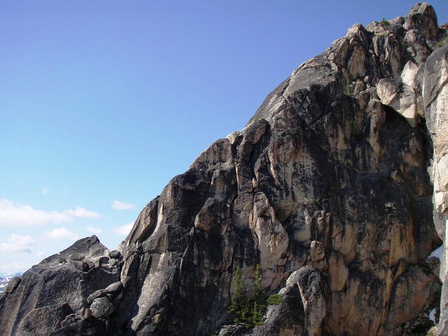 Looking at the 8th and 9th pitches of SW buttress route from the south arete
