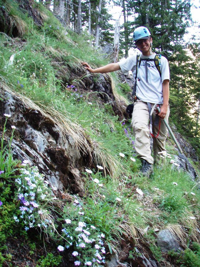 scrambling up two steep sections of 3rd class gully/meadow. Soon we