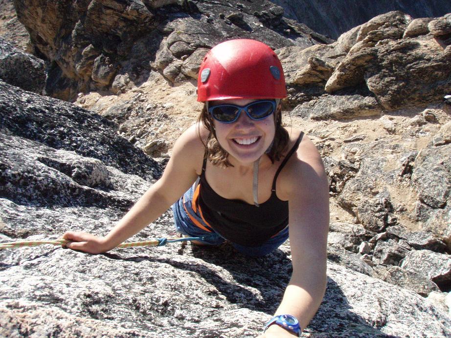 Lindsay climbing the final moves on Golden Horn