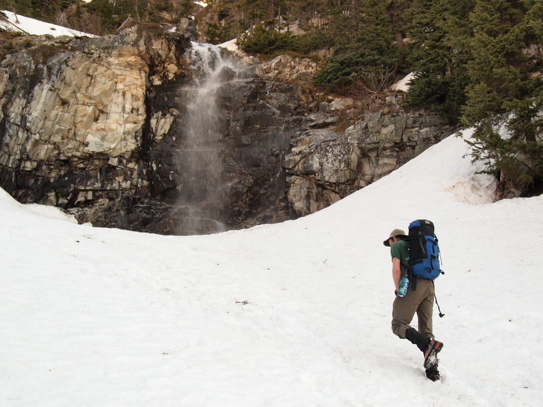 Walking below the waterfall that the summer trail to Snoqualmie Mtn crosses above.