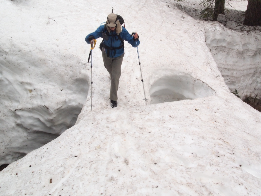 Monique crossing a snow bridge in Commonwealth Basin.