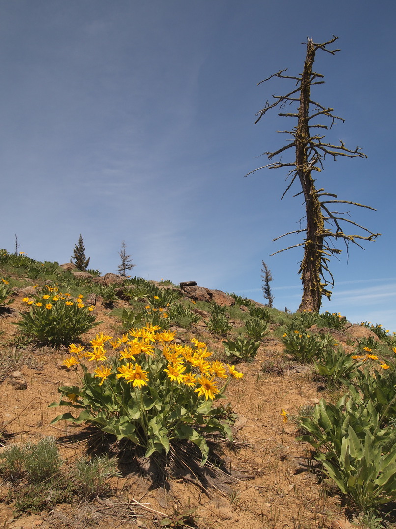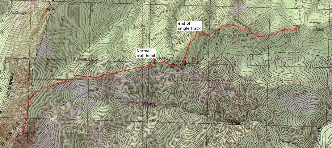 I parked on Road 7305 were it goes over a 2,800' col. I noticed a bike trail there and decided to give it a try. The trail went up to 4,000', from there I followed old logging roads and a bit of brush to the normal trail head