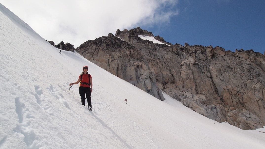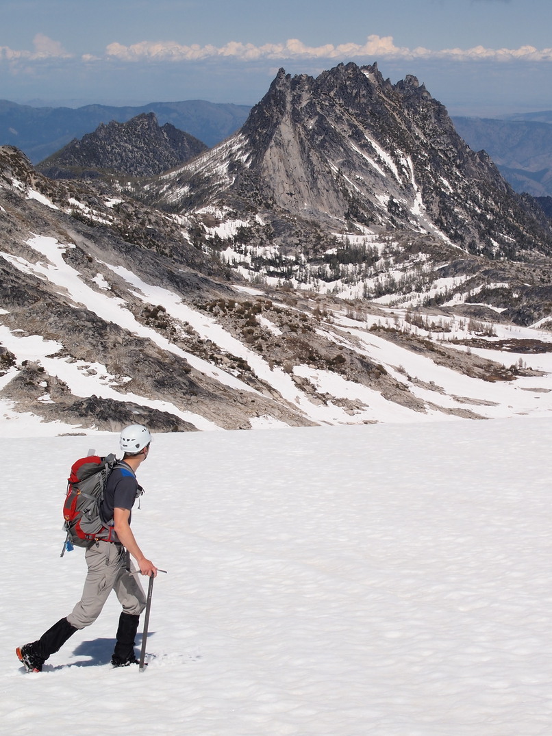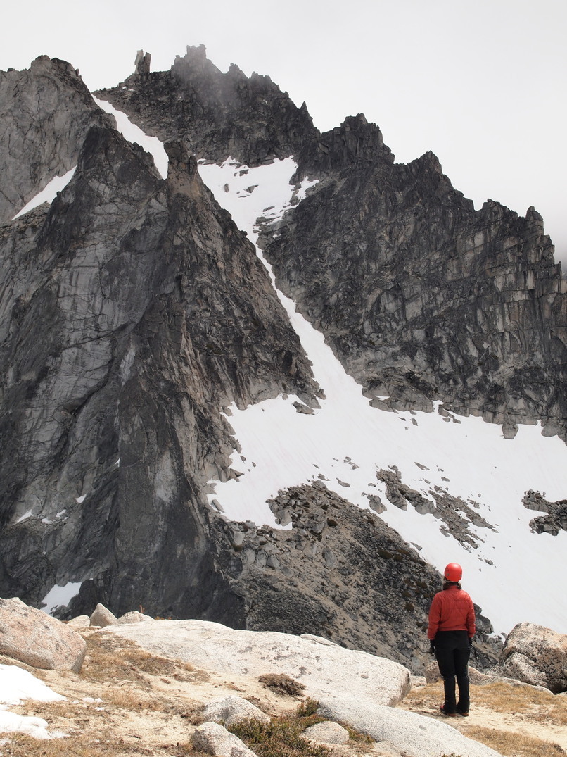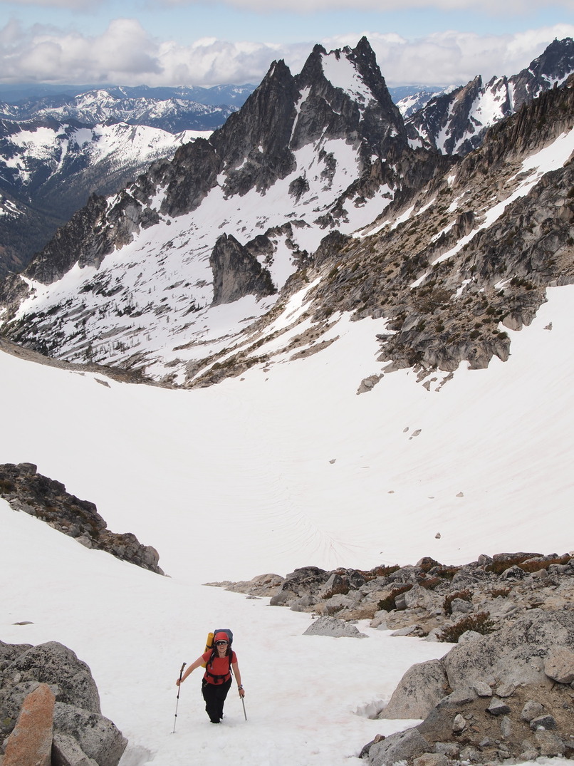 Lindsay looking across Colchuck Col to the snow gully leading to Pandora's Box. That is where we are headed next.