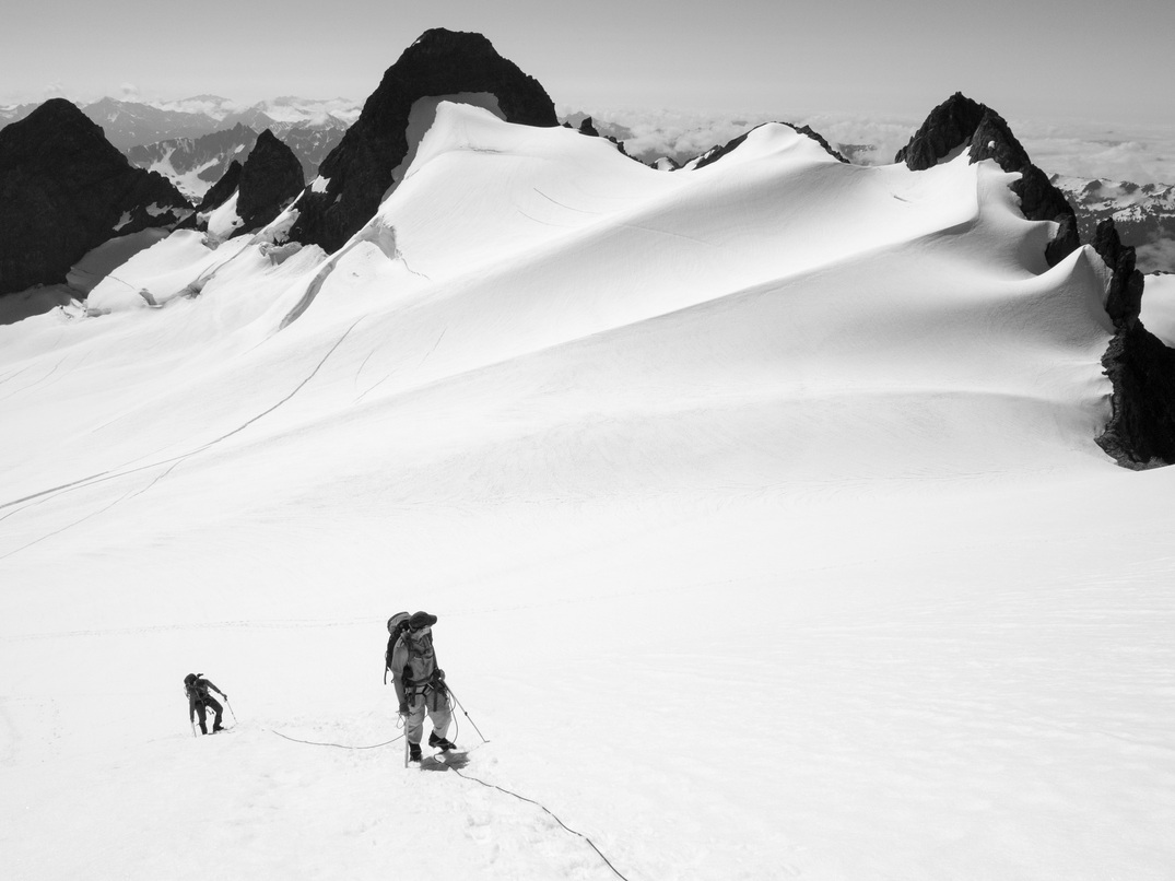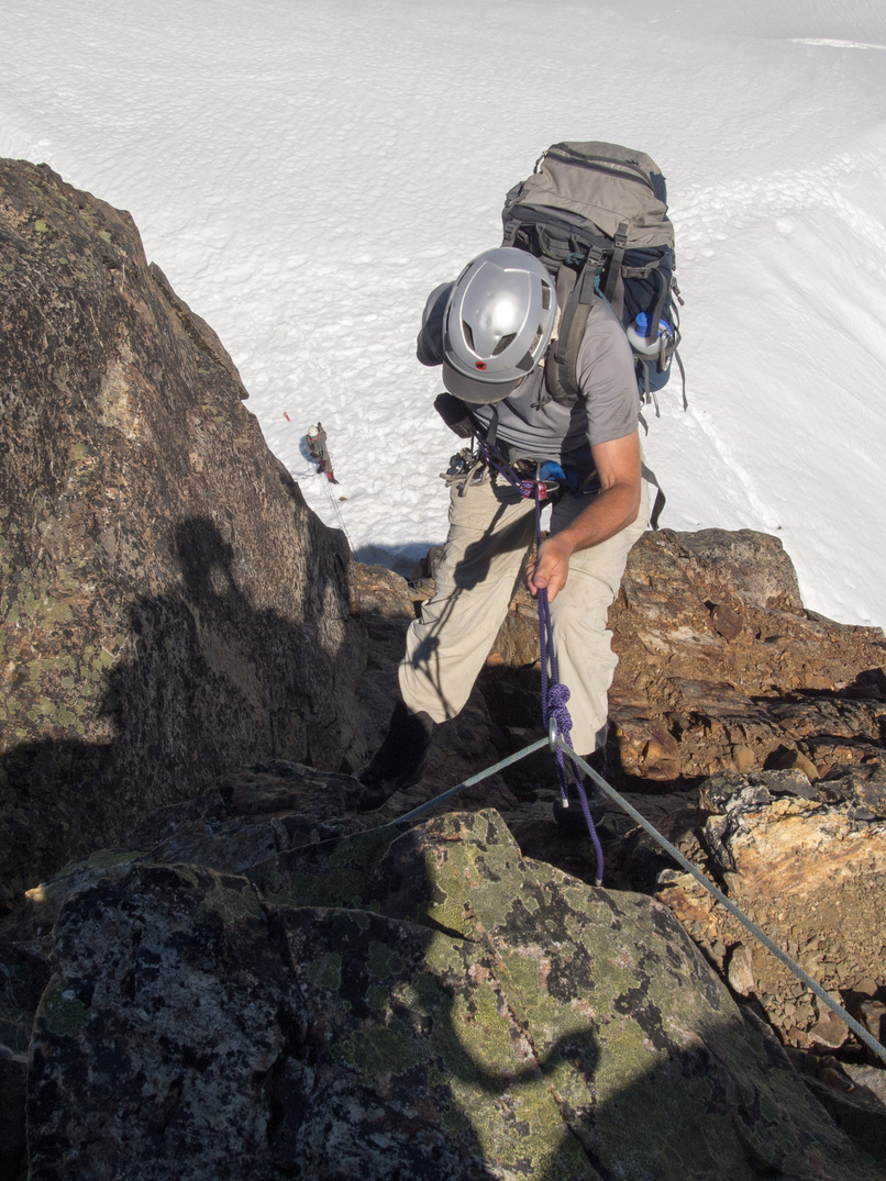 Tristan leading the 30 meter rock route that leads directly to the rap station on the north side of the peak. The crux of the climbing was moving from the snow, over the moat, and onto the rock