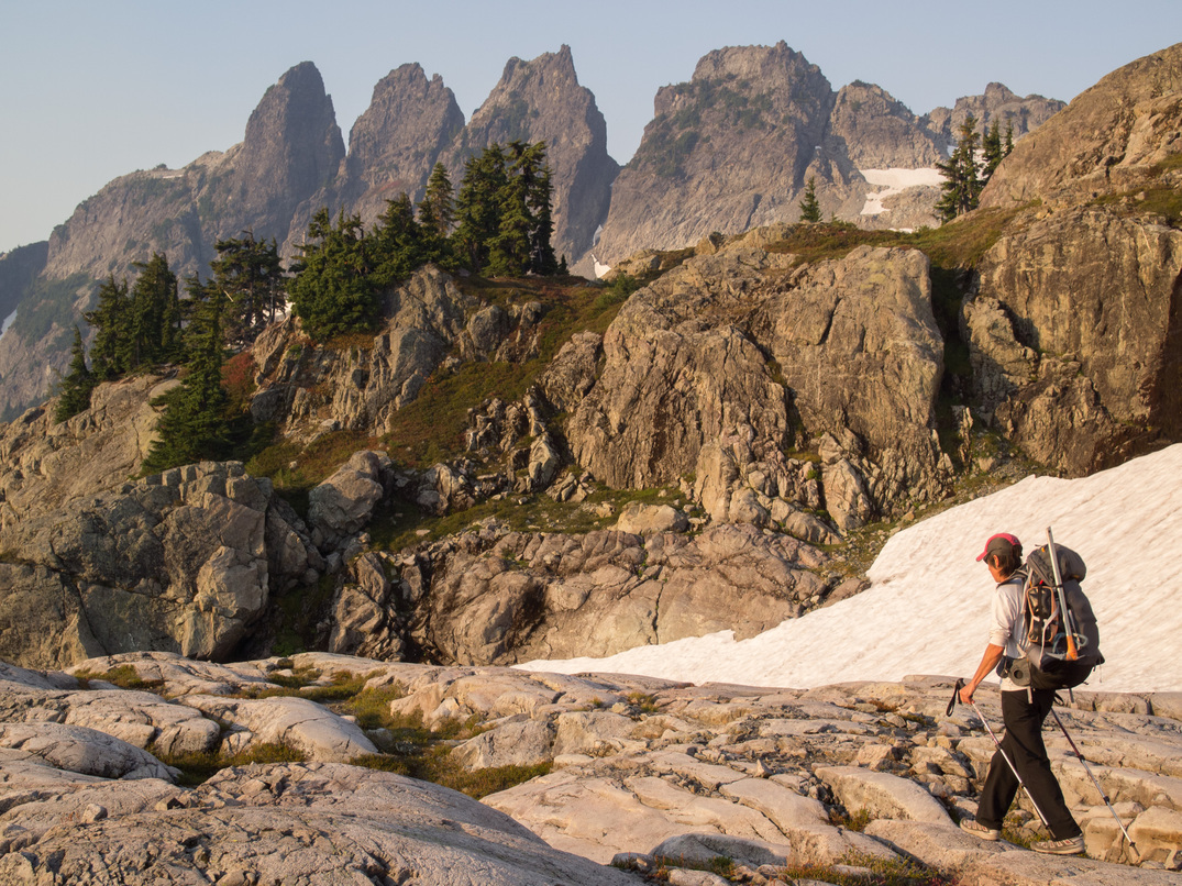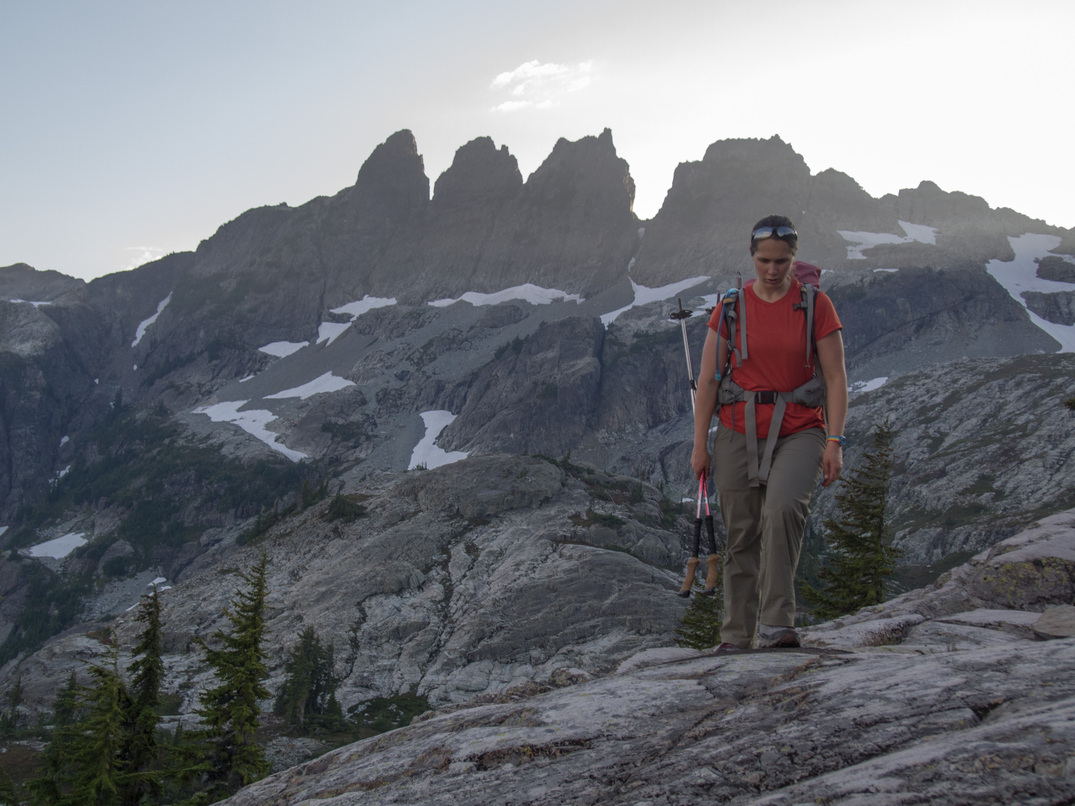 Early morning yoga below Chikamin Lake. The SE towers of Lemah are in the background.