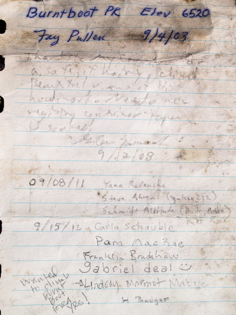 Carla on the summit of Burnt Boot Peak, with Lemah Peak looming in the background.