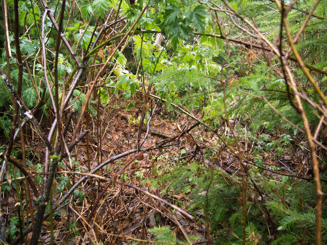 I continued SE toward Brew Hill, skirting the watershed boundary. Unfortunately, I discovered that the boundary has expanded eastward since my map was made and has completely engulfed Brew Hill. I followed the new boundary east for a while, eventually it became very brushy and I gave up.