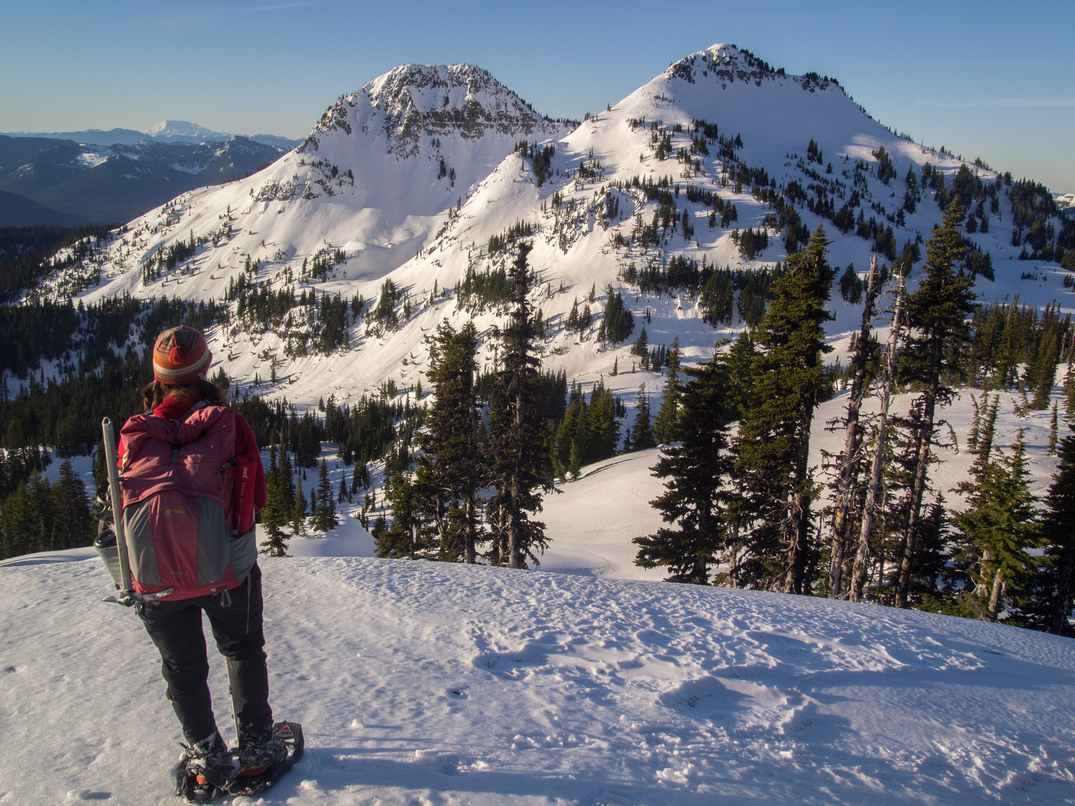 On the summit of Pyramid Peak, after a steep, icy climb. The crampon on Lindsay's left foot is falling off.
