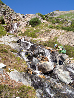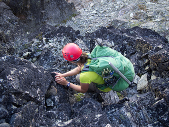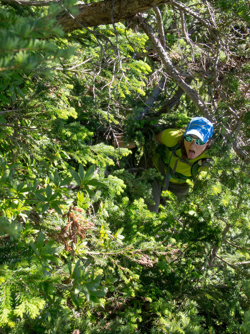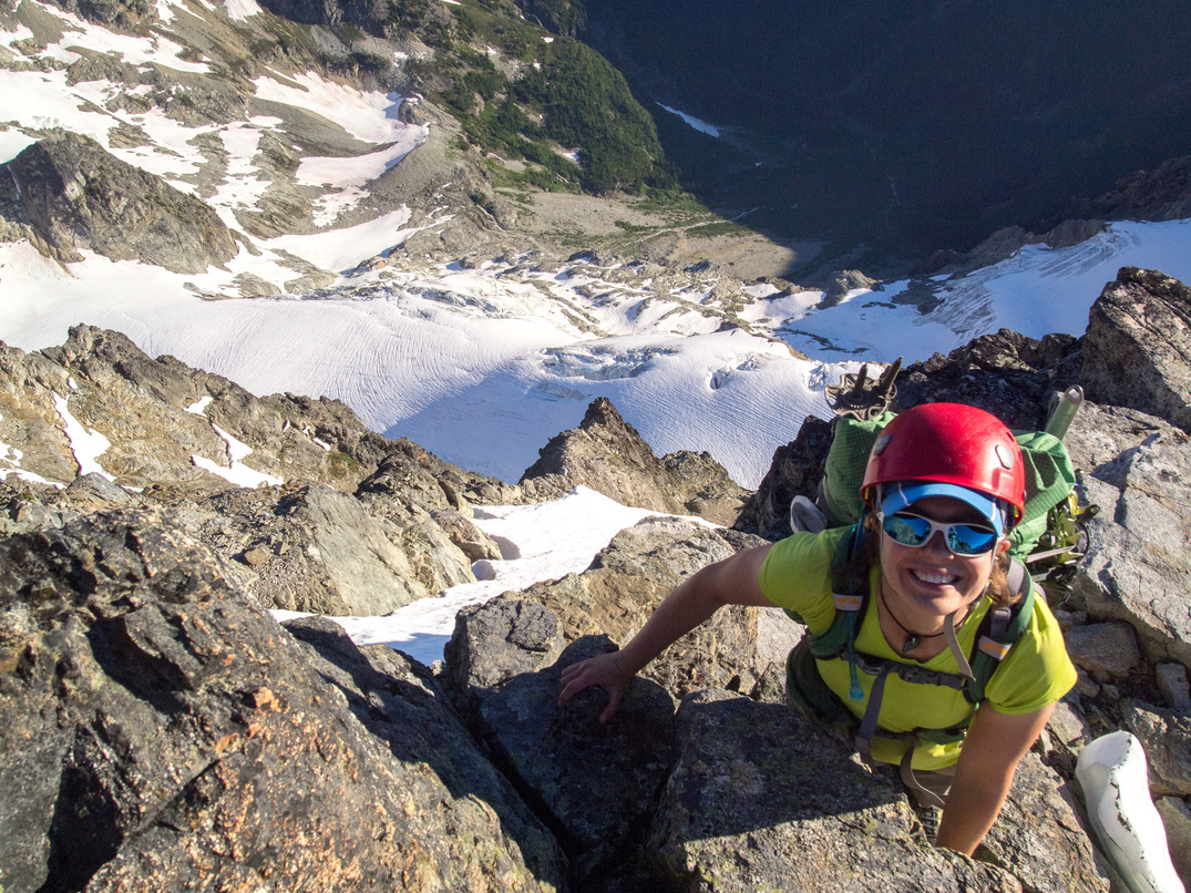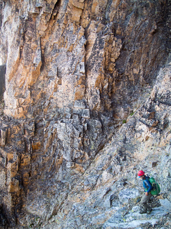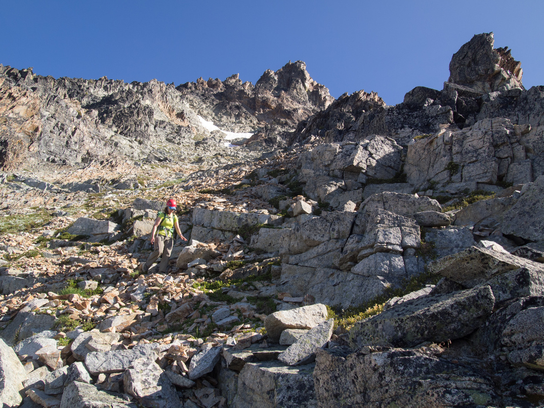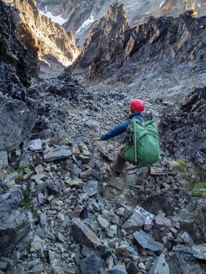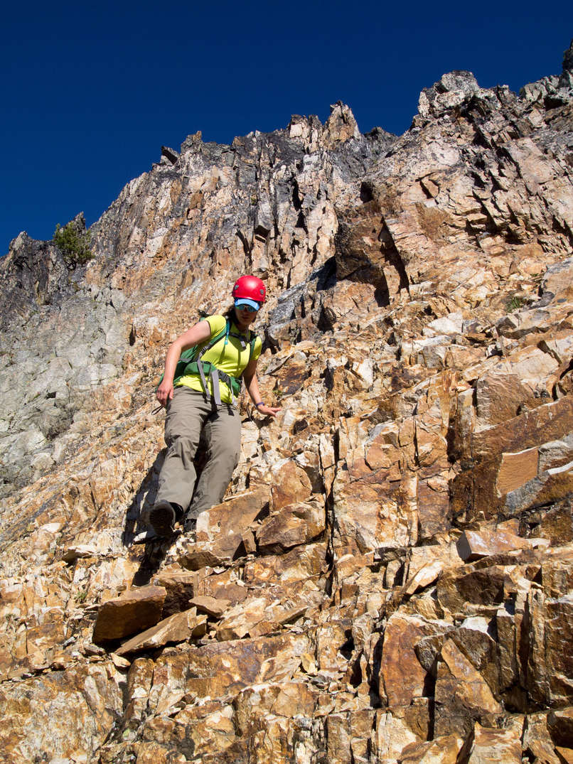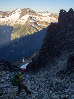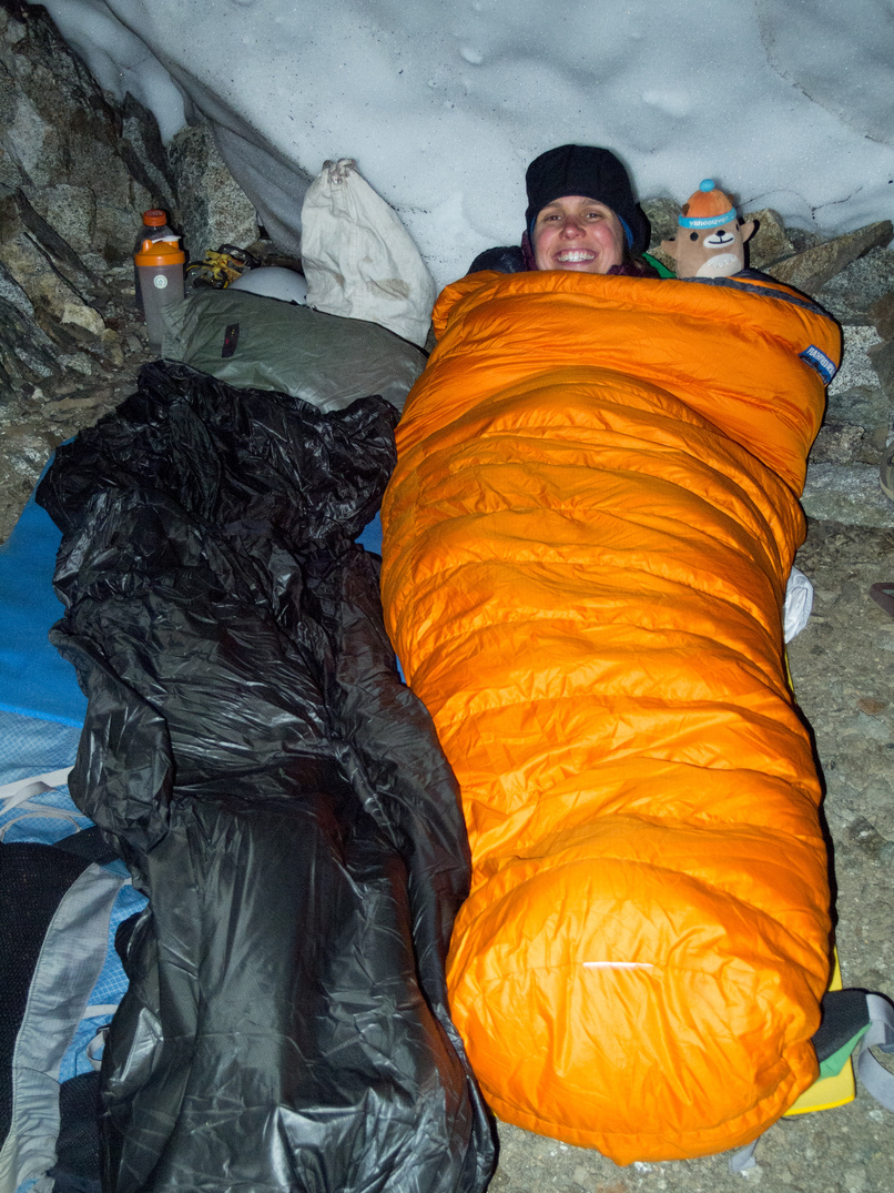 Out cozy bivy spot at the 8,200' col between Katsuk and Mesahchie. Little did we know we would be besieged by a wood rat for much of the night! It was particularly entranced by Lindsay's shiny crampons.