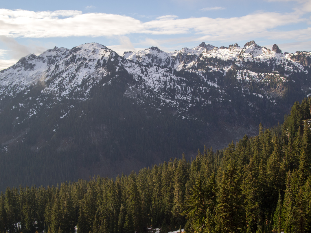 Thor Peak, Nimbus Mountain, and Slippery Slab Tower from the south slopes of The Hydrant.