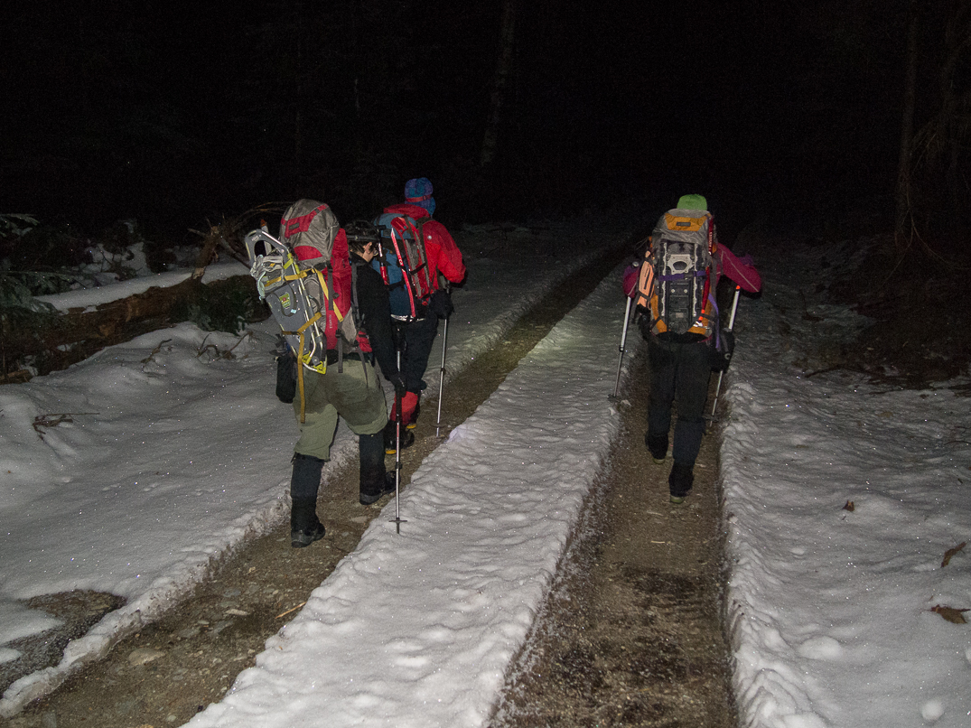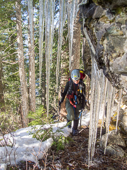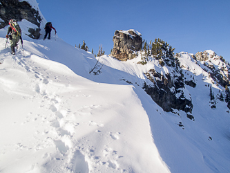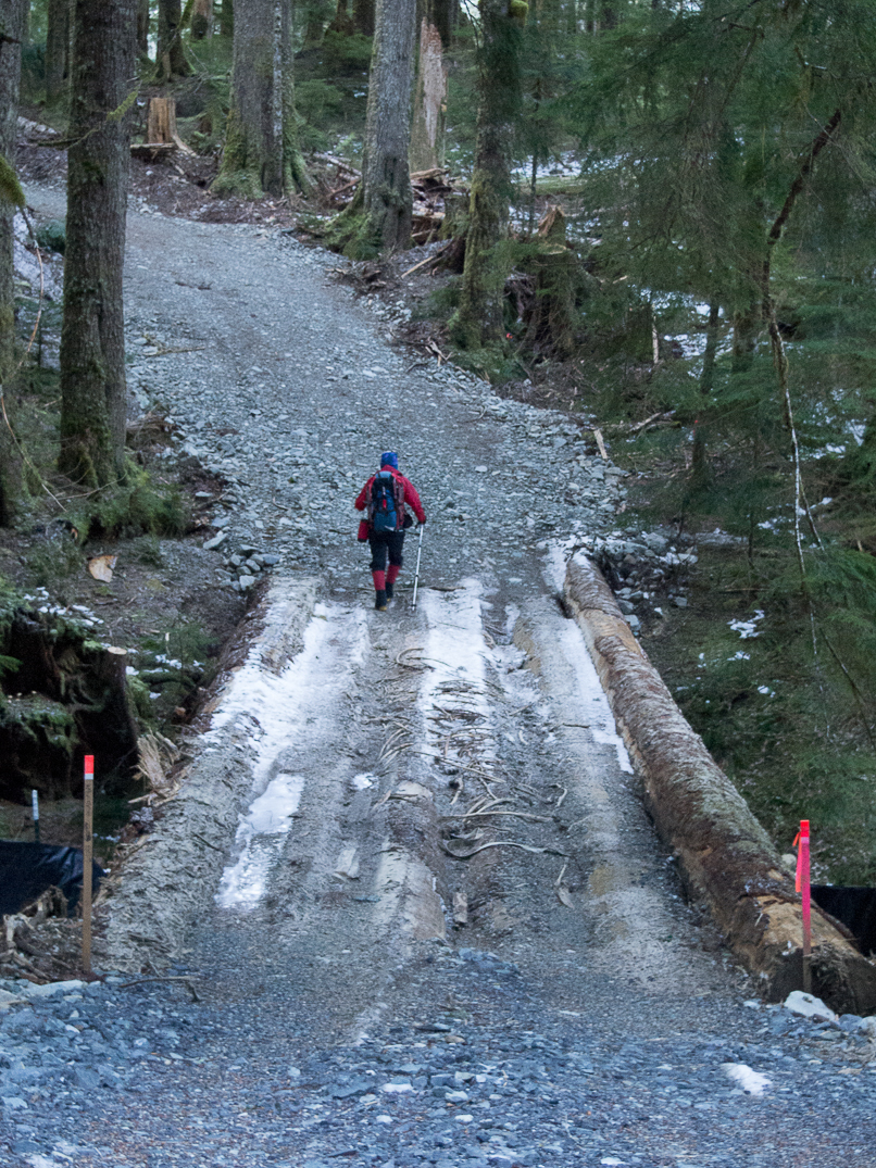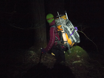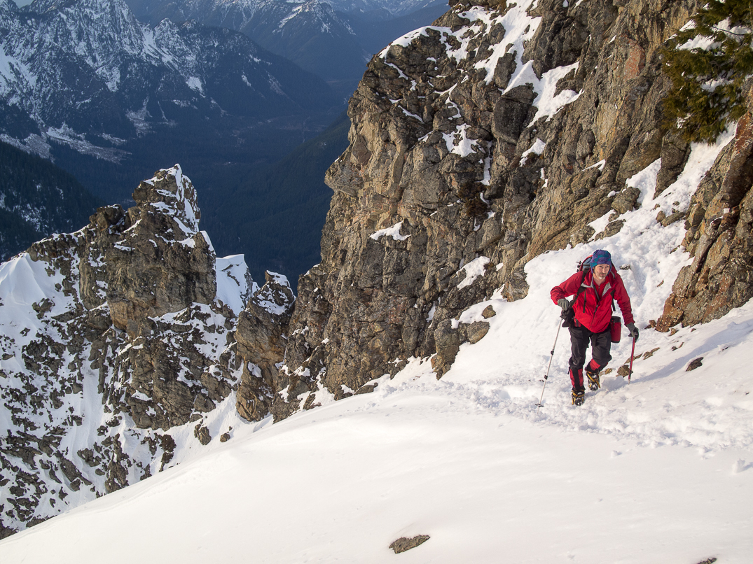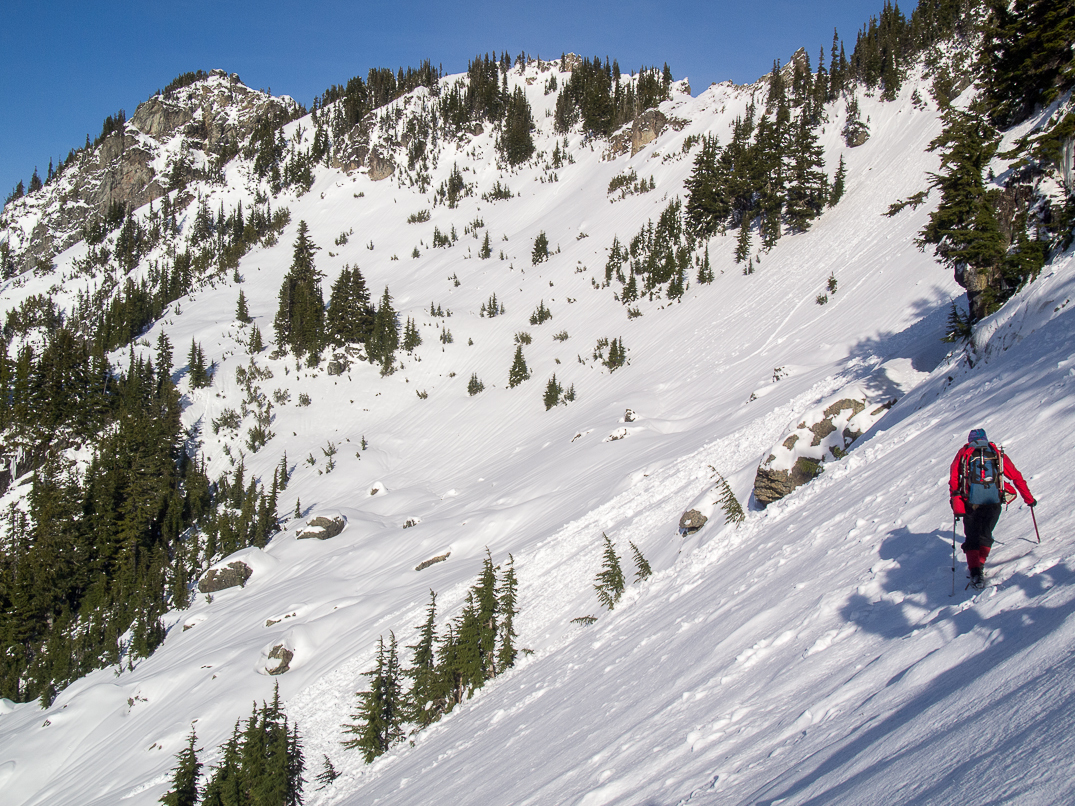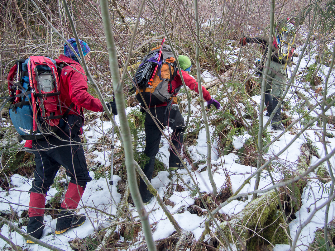 The crux of the trip was this steep, cedar-choked gully followed by an unpleasant, duff slab.