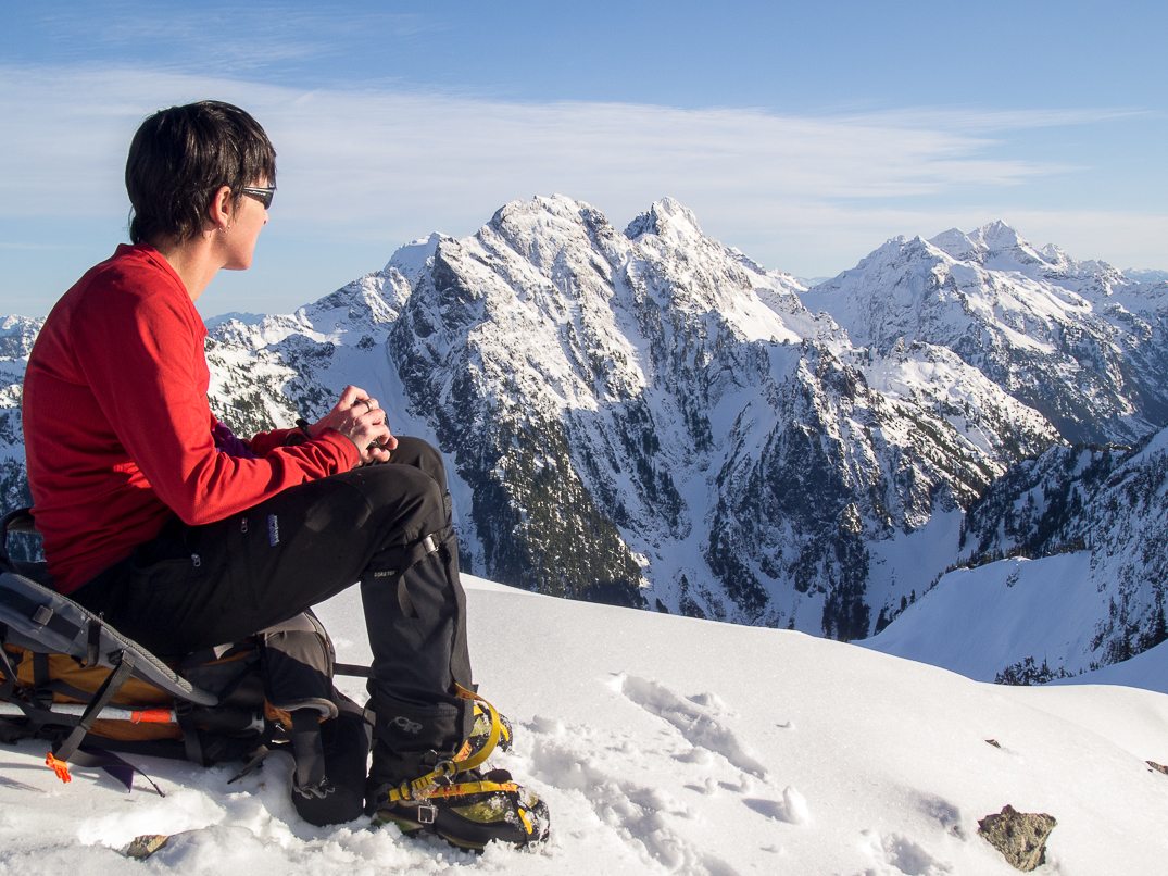Yana, Carla, and Matt on the summit with Sloan Peak peeking out from behind.