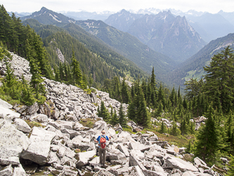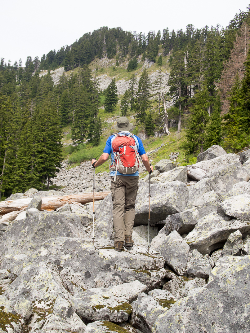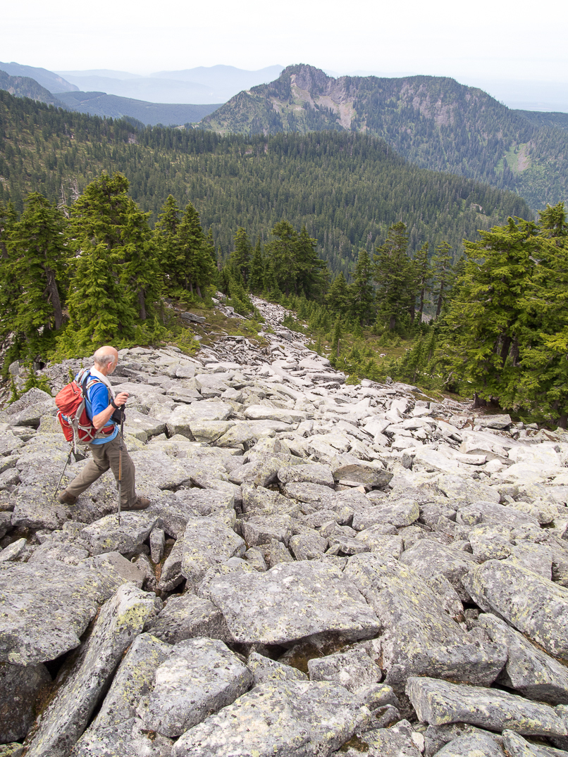 Ascending the long boulder field on Paperboy's south slopes. Quartz Mountain in the background.