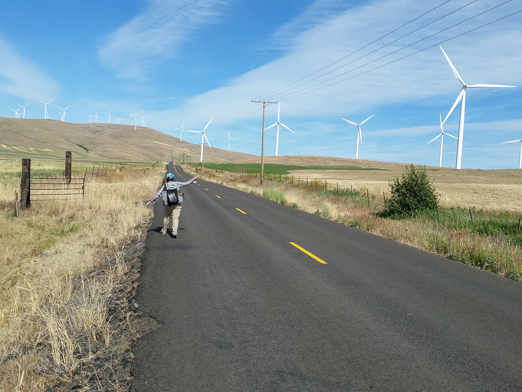 Walking through the Windy Flats Wind Farm on Stringstreet Road.