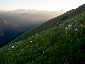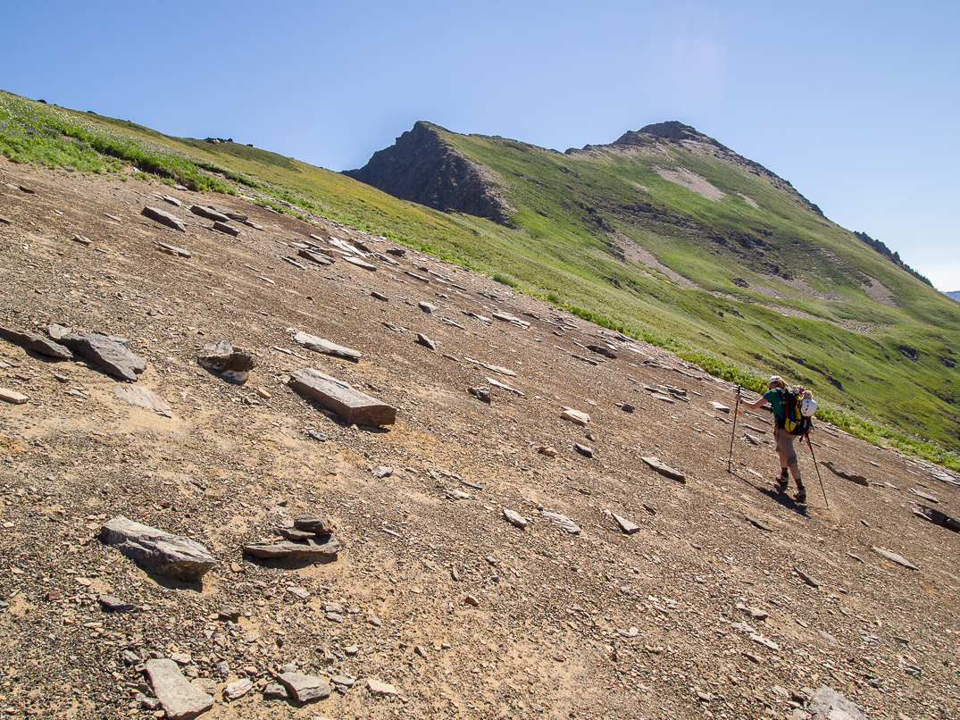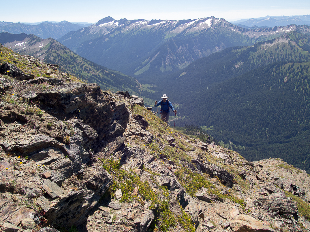 Descending the SW sub-ridge of Indian Head. Kodak Peak and Johnson Mountain in the background.
