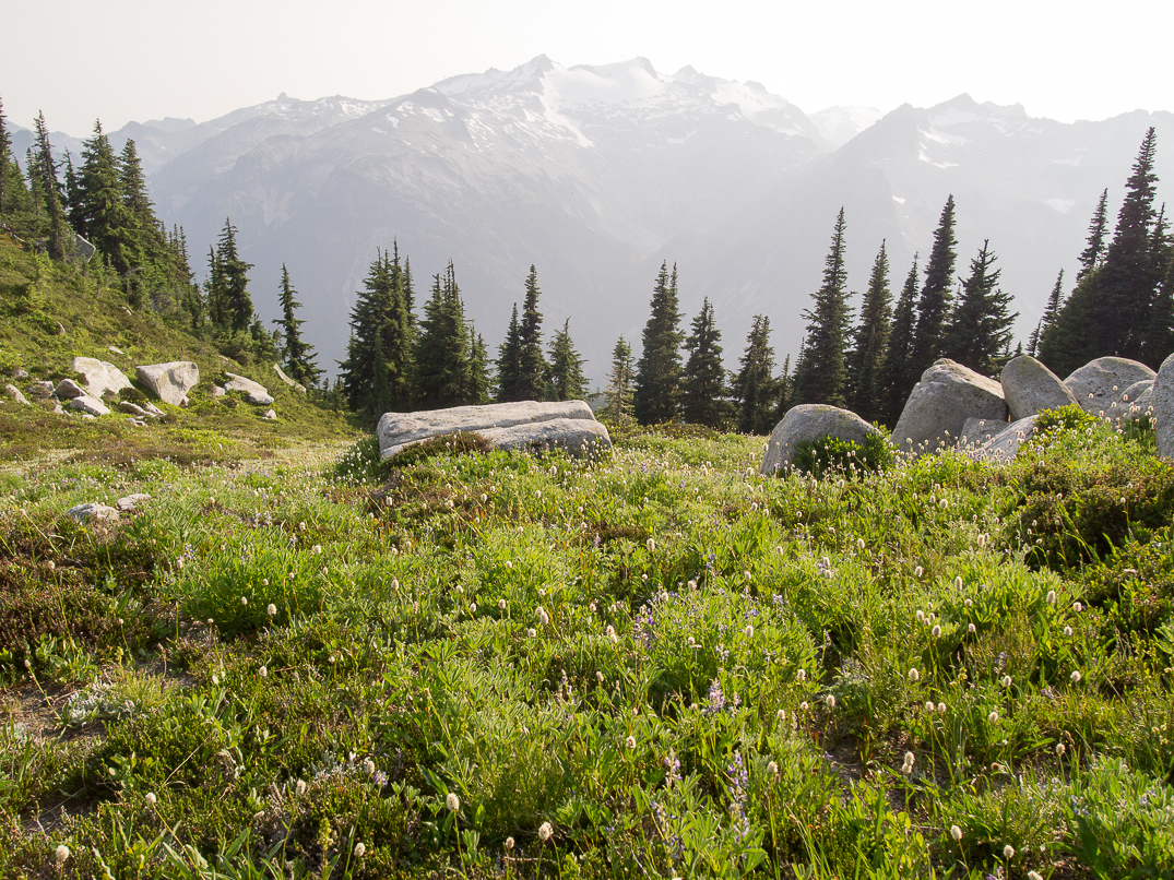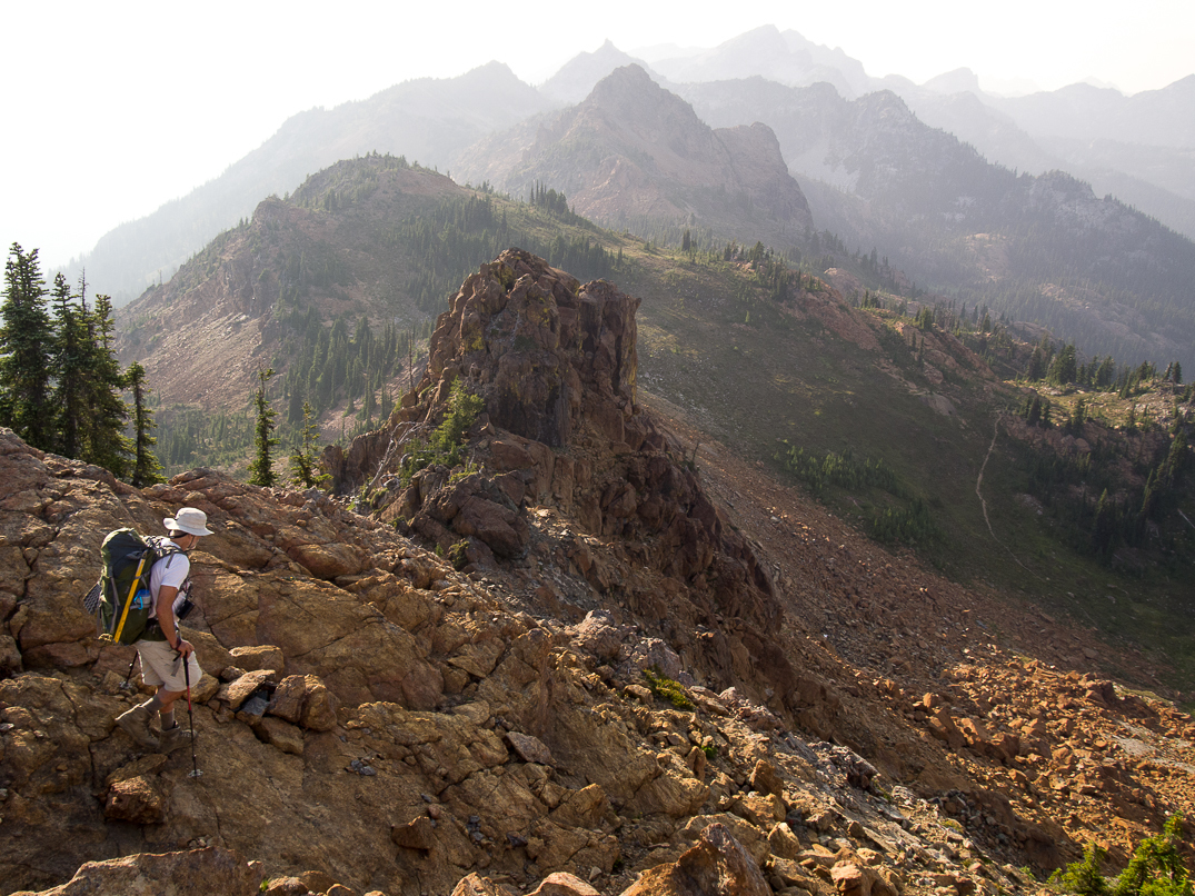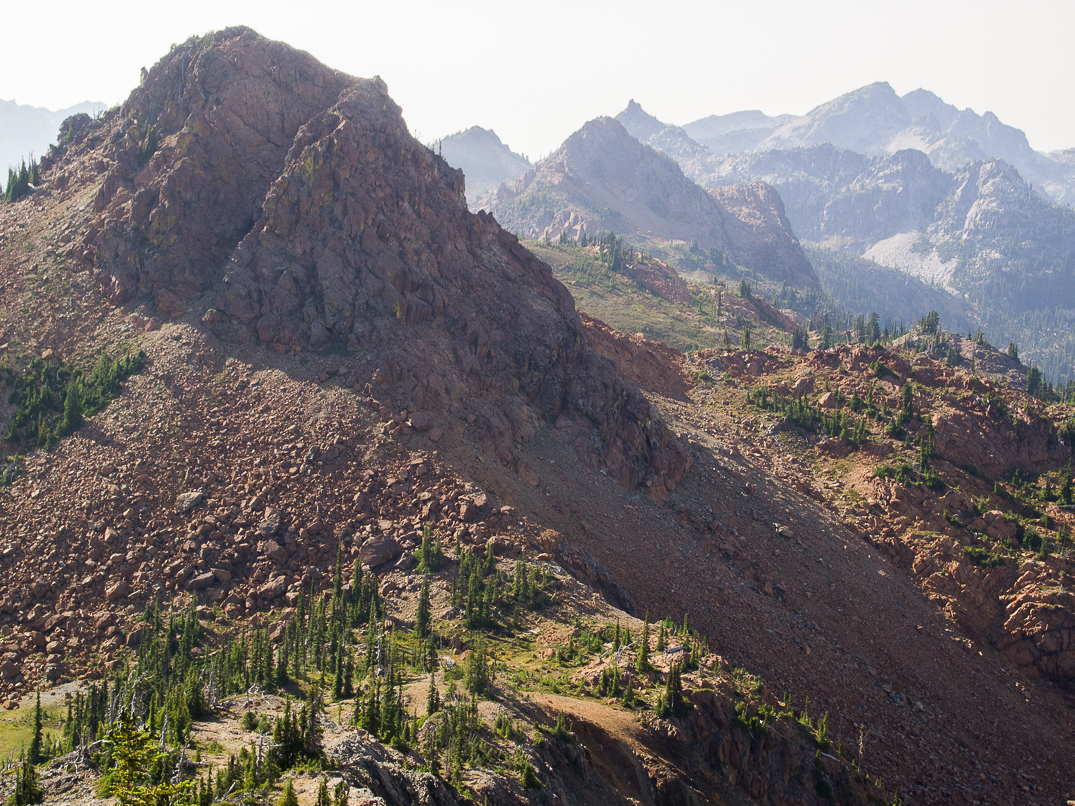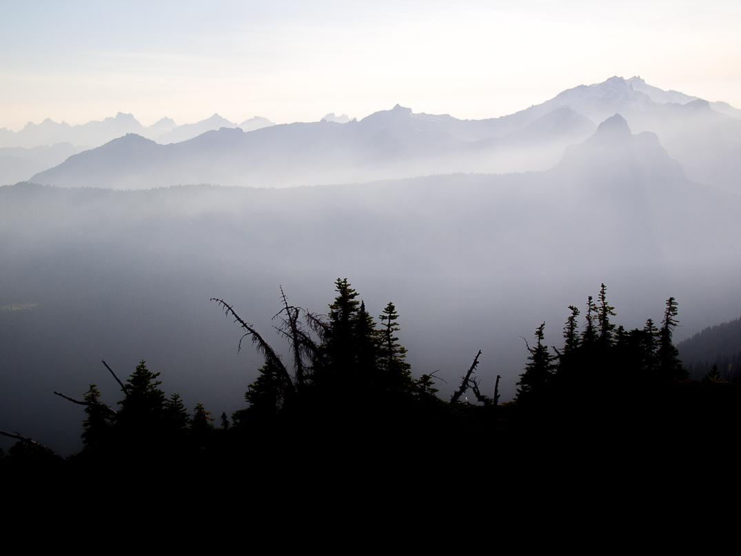 Looking west at Mount Daniel and the Snoqualmie Range through the smoke haze.