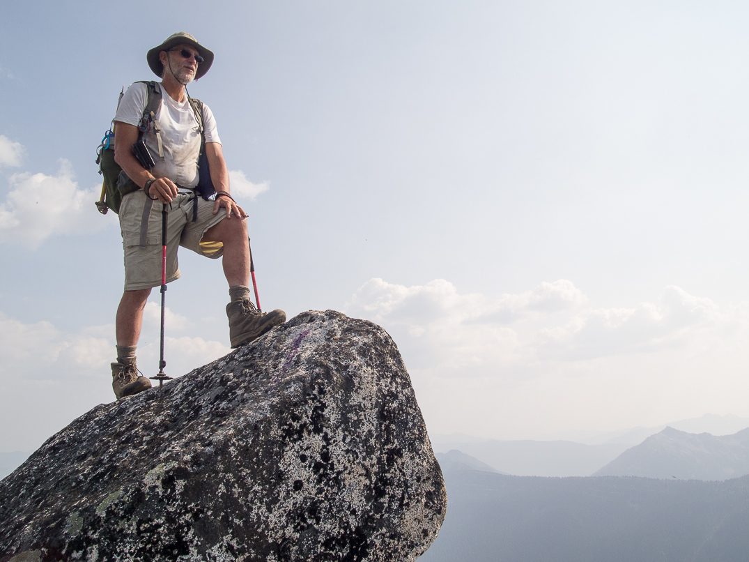 On the summit of Paddy-Go-North, with Sherpani Peak in the background. Our route up Paddy-Go-North's NE ridge involved a very short section of high class 3.