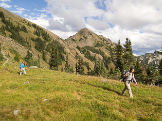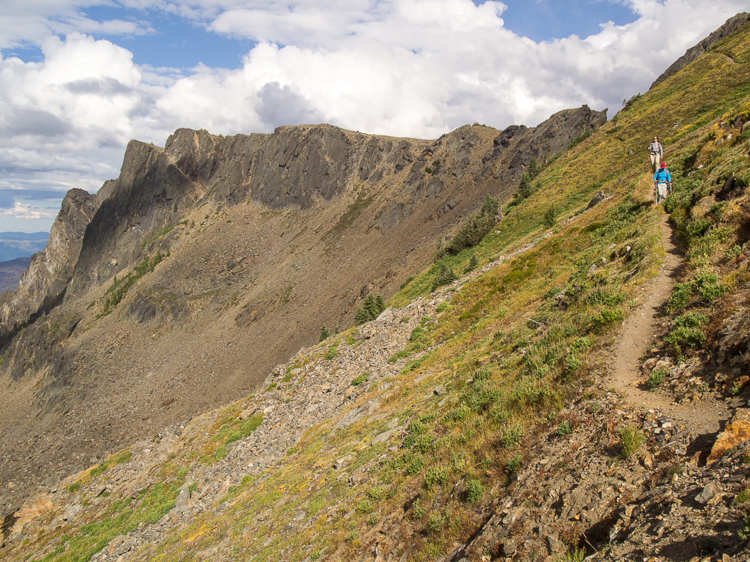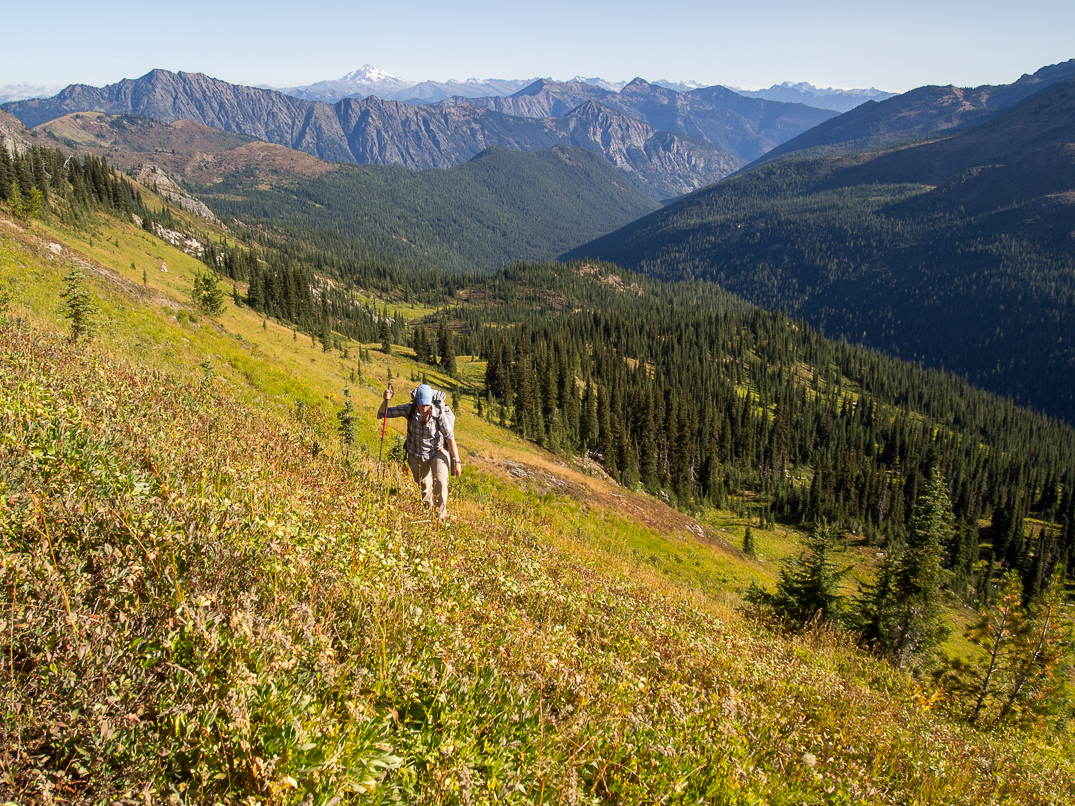 Ascending the NE side of Cape Horn. Ladies Peak and Snowgrass Mountain in the background.